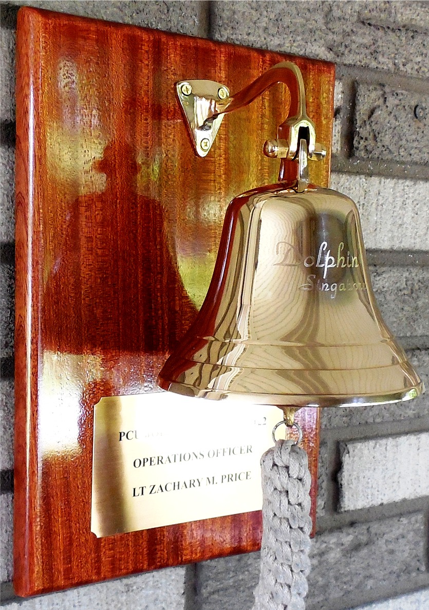 solid brass ship's bell mounted on a solid hardwood plaque