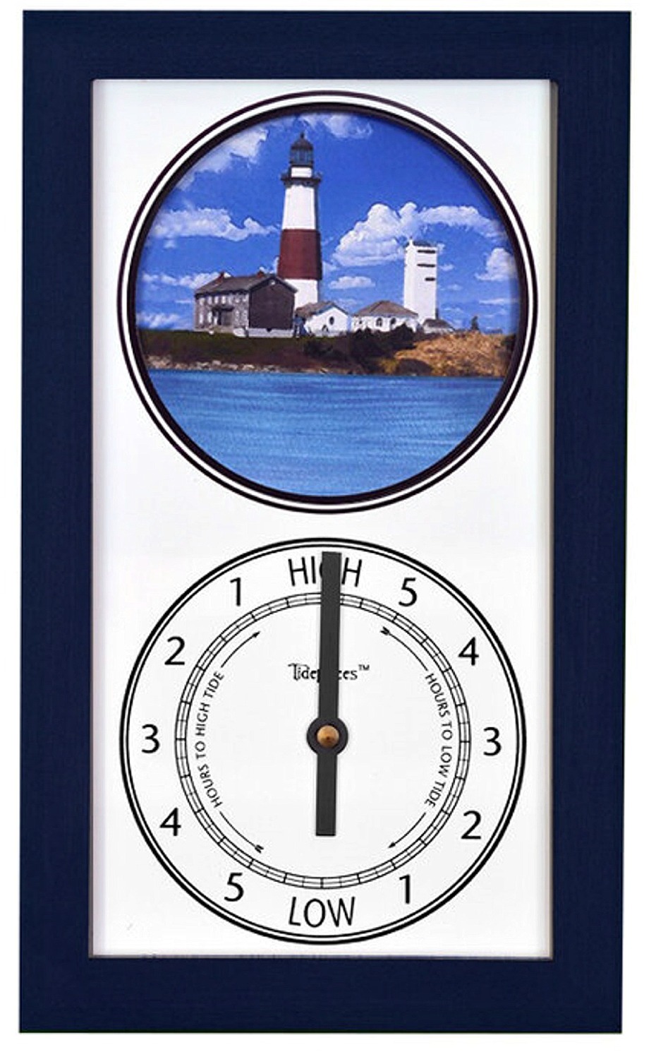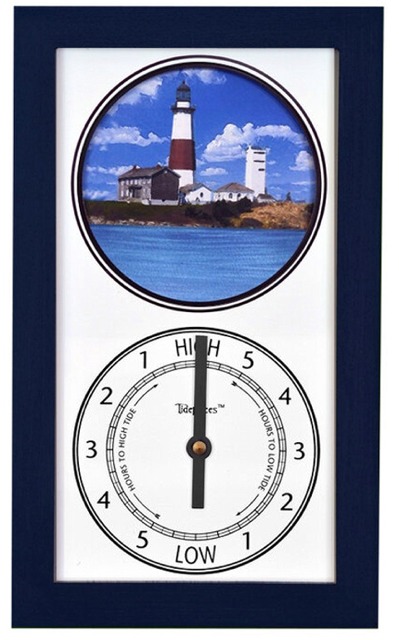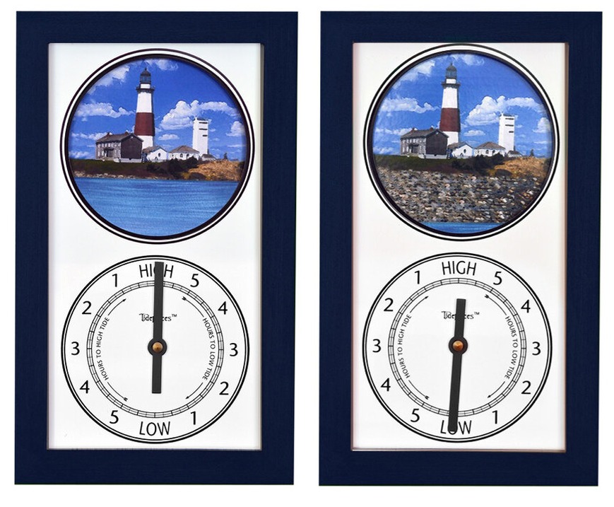 Clock hand indicates the tide level (low tide, rising