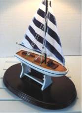 sailboat mounted on a cherry wood base with brass lamp